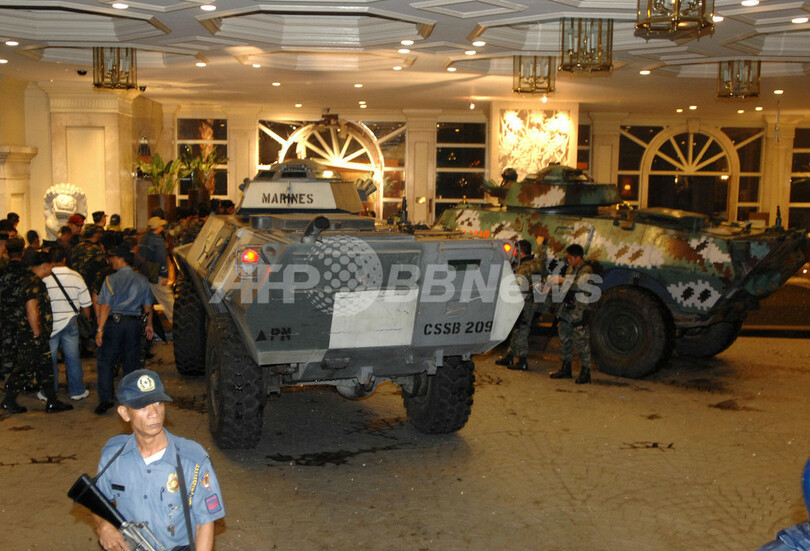 【11月29日 AFP】(30日写真追加)フィリピンのマニラ(Manila)首都圏マカティ(Makati)市内で29日、ペニンシュラ・ホテル(Peninsula Hotel)に反乱将校らのグループが立てこもりグロリア・アロヨ(Gloria Arroyo)大統領の辞任を要求していた事件は、同日午後、治安部隊がホテルに突入。反乱グループは全員投降し身柄を拘束された。