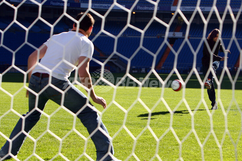 【12月1日 AFP】男子テニス世界ランキング2位(2007年11月26日付け)のラファエル・ナダル(Rafael Nadal、スペイン)とサッカースペイン・リーガエスパニョーラ1部のレアル・マドリード(Real Madrid)に所属するイケル・カシージャス(Iker Casillas)が、レアル・マドリードの本拠地サンチャゴ・ベルナベウ(Santiago Bernabeu Stadium)で赤十字社(Red Cross)の「世界マラリア撲滅キャンペーン」のメディア向けイベントに出席し、キャンペーンのアピールを行った。(c)AFP