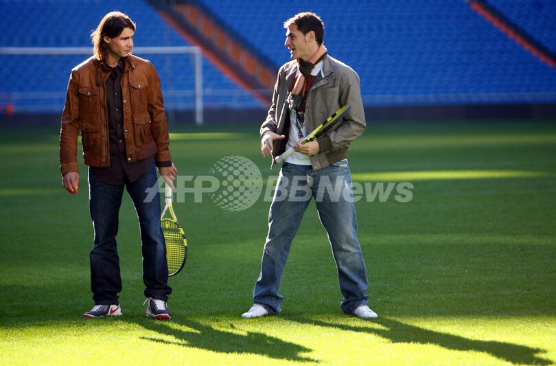 【12月1日 AFP】男子テニス世界ランキング2位(2007年11月26日付け)のラファエル・ナダル(Rafael Nadal、スペイン)とサッカースペイン・リーガエスパニョーラ1部のレアル・マドリード(Real Madrid)に所属するイケル・カシージャス(Iker Casillas)が、レアル・マドリードの本拠地サンチャゴ・ベルナベウ(Santiago Bernabeu Stadium)で赤十字社(Red Cross)の「世界マラリア撲滅キャンペーン」のメディア向けイベントに出席し、キャンペーンのアピールを行った。(c)AFP