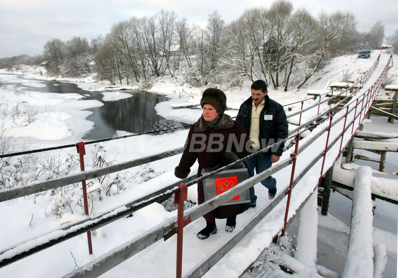 一方、農業を営むLyudmila Voyevodinaさん(46)は、「政治家なんてどれもこれも同じで、うんざり。農民の話をちっとも聞いてくれないんだから」とぼやいた。すると驚いたことに、投票箱を持っている選挙管理委員が「その通りですよね」と応じる一幕も見られた。(c)AFP/Marina Lapenkova