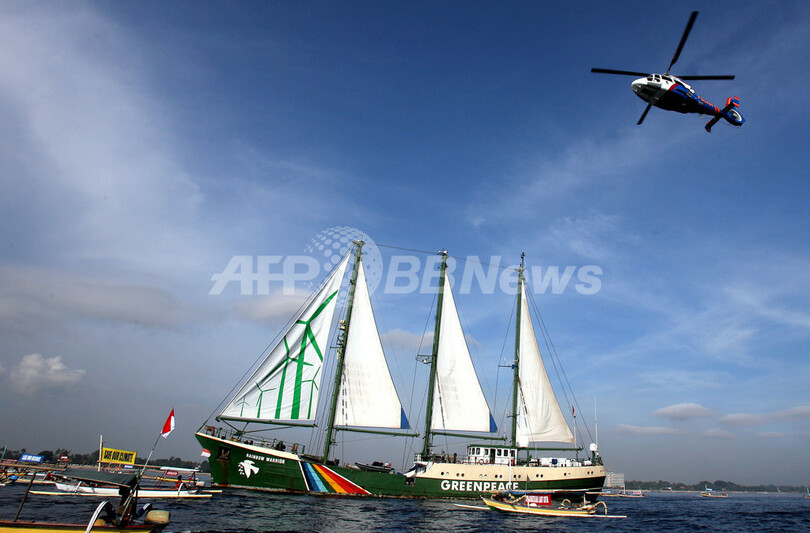 【12月7日 AFP】国際環境保護団体グリーンピース(Greenpeace)の船「虹の戦士(Rainbow Warrior)」号が7日、国連気候変動枠組み条約(UNFCCC)の第13回締約国会議(COP13)が開かれているインドネシアのバリ(Bali)島、ヌサドゥア(Nusa Dua)沖合に到着した。