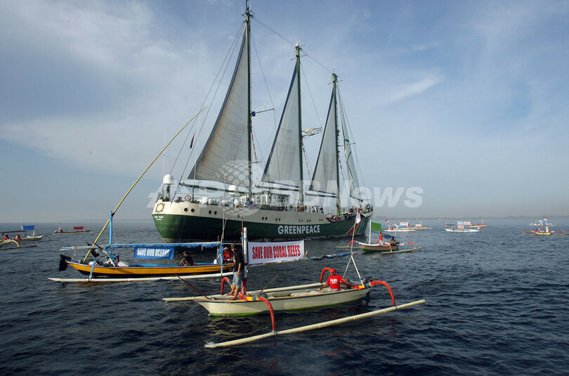 【12月7日 AFP】国際環境保護団体グリーンピース(Greenpeace)の船「虹の戦士(Rainbow Warrior)」号が7日、国連気候変動枠組み条約(UNFCCC)の第13回締約国会議(COP13)が開かれているインドネシアのバリ(Bali)島、ヌサドゥア(Nusa Dua)沖合に到着した。