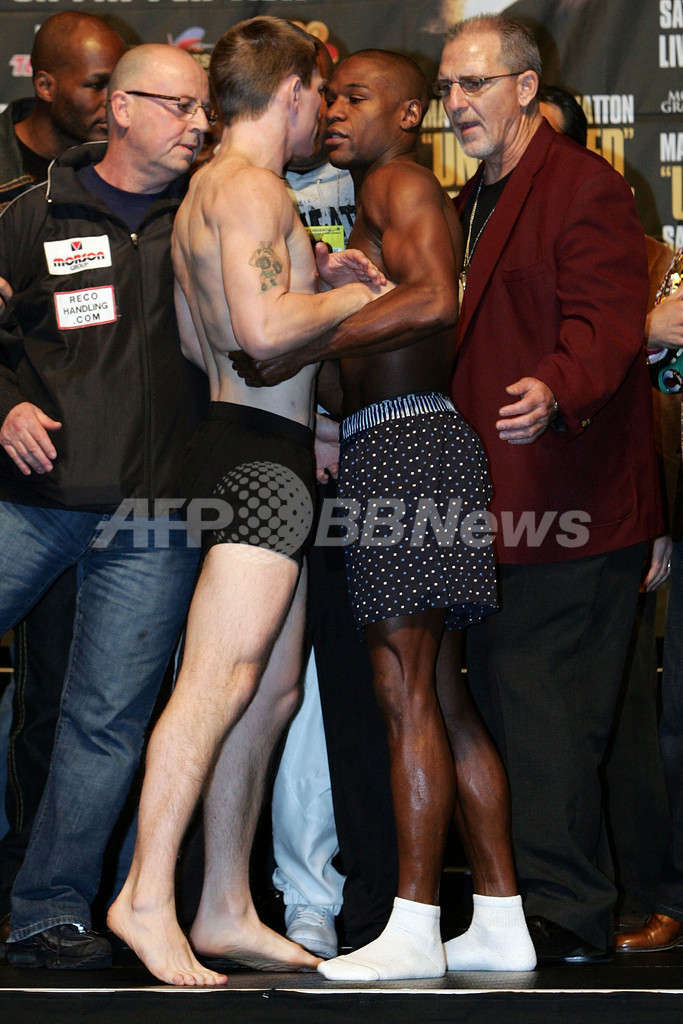 【12月8日 AFP】ボクシングWBC世界ウェルター級タイトルマッチ、王者フロイド・メイウェザー・ジュニア(Floyd Mayweather Jr.、米国)対挑戦者リッキー・ハットン(Ricky Hatton、英国)戦を現地8日に控えた7日、メイウェザー・ジュニアとハットンはMGMグランドガーデン・アリーナ(MGM Grand Garden Arena)で行われた公開計量に臨み、ハットンは145ポンド(約65.7キログラム)で通過し、一方のメイウェザー・ジュニアは規定重量の147ポンド(66.6キログラム)で通過した。(c)AFP