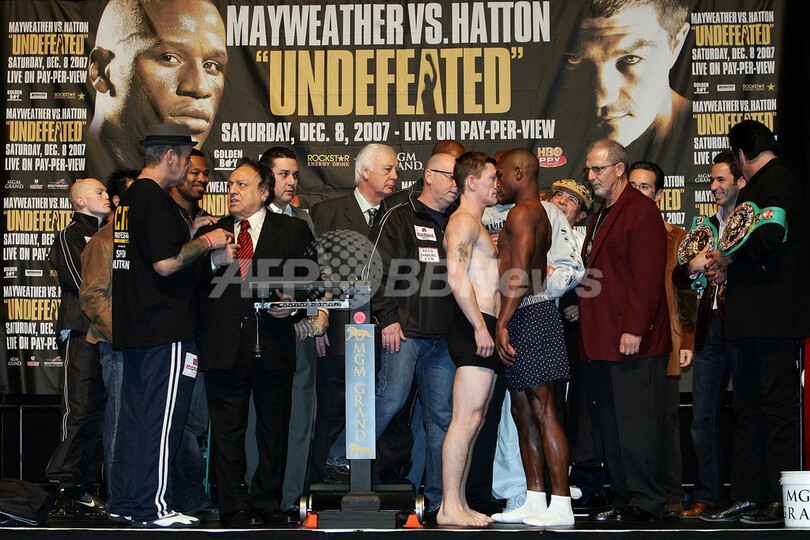 【12月8日 AFP】ボクシングWBC世界ウェルター級タイトルマッチ、王者フロイド・メイウェザー・ジュニア(Floyd Mayweather Jr.、米国)対挑戦者リッキー・ハットン(Ricky Hatton、英国)戦を現地8日に控えた7日、メイウェザー・ジュニアとハットンはMGMグランドガーデン・アリーナ(MGM Grand Garden Arena)で行われた公開計量に臨み、ハットンは145ポンド(約65.7キログラム)で通過し、一方のメイウェザー・ジュニアは規定重量の147ポンド(66.6キログラム)で通過した。(c)AFP