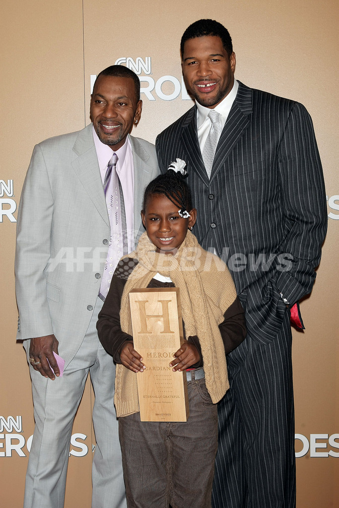 2007年12月6日、ニューヨークにある米自然史博物館(American Museum of Natural History)で行われた、全世界へと生中継で放送される「CNN Heroes: An All-Star Tribute」のバックステージでポーズをとる、受賞者の%%Wesley Autrey%%(左)、娘の%%Shuqui Autrey%%(中央)、NFL、ニューヨーク・ジャイアンツ(%%New York Giants%%)のマイケル・ストレイハン(%%Michael Strahan%%)。(c)AFP/Getty Images Scott Gries