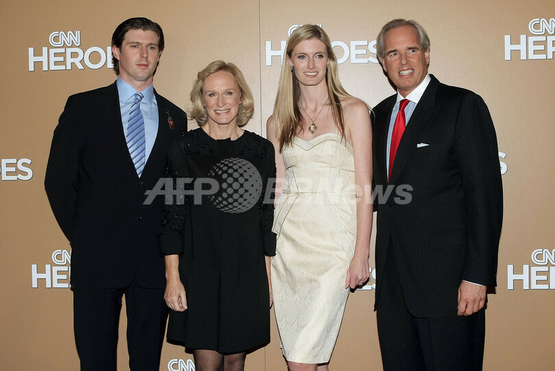 2007年12月6日、ニューヨークにある米自然史博物館(American Museum of Natural History)で行われた、全世界へと生中継で放送される「CNN Heroes: An All-Star Tribute」のバックステージでポーズをとる、(左から)マシュー・リーヴ(%%Matthew Reeve%%)、女優のグレン・クローズ(%%Glenn Close%%)、アレキサンドラ・リーブ(%%Alexandra Reeve%%)、ピーター・D.キアナンⅢ(%%Peter D. Kiernan Ⅲ%%)。(c)AFP/Getty Images Scott Gries
