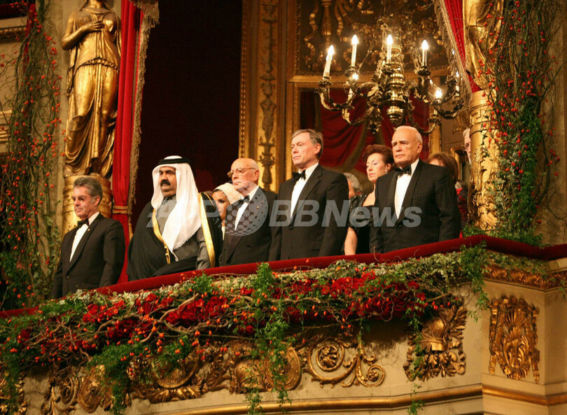 2007年12月7日、ミラノ(Milan)のスカラ座(La Scala)で開かれた作曲家リヒャルト・ワーグナー(Richard Wagner)の歌劇『トリスタンとイゾルデ(Tristan und Isolde)』初回公演でメインバルコニーに立つ(左から)オーストリアのハインツ・フィッシャー(%%Heinz Fischer%%)大統領、カタールの%%Sheikh Hamad bin Khalifa al-Thani%%首長、イタリアのジョルジョ・ナポリターノ(%%Giorgio Napolitano%%)大統領、ドイツのホルスト・ケーラー(%%Horst Koehler%%)大統領、ミラノのレティツィア・モラッティ(%%Letiz Moratti%%)市。(c)AFP
