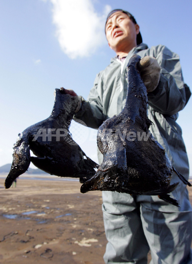 【12月9日 AFP】(一部修正)韓国西岸沖合で、はしけが香港船籍のタンカーに衝突し積荷の原油が流出した事故で9日、軍とボランティア数千人が原油除去作業を行った。