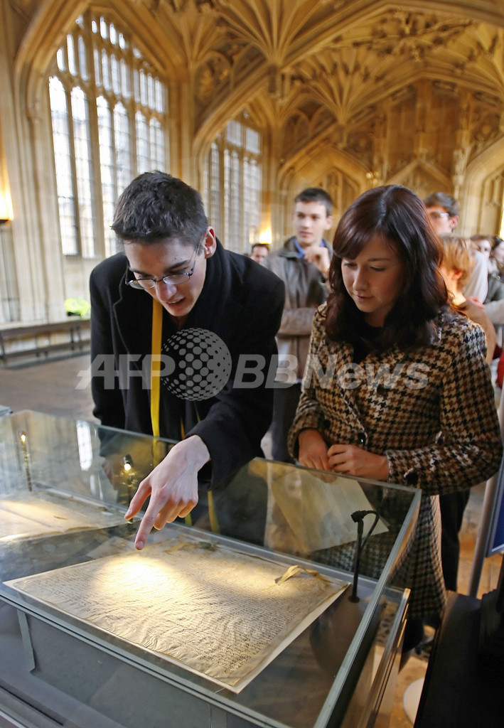 【12月14日 AFP】(一部更新)民主主義の歴史上最も重要な法律文書の1つ、マグナカルタ(大憲章、Magna Carta)の4部の公式写本が11日、英オックスフォード(Oxford)大学のボードリアン図書館(Bodleian Library)で800年ぶりに一般公開された。