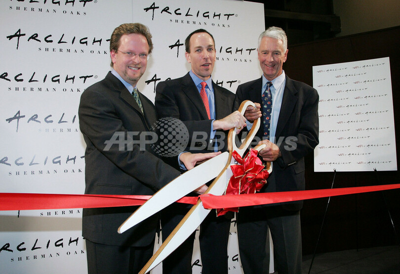 2007年12月12日、新しくオープンしたアークライト・シャーマンオークス(ArcLight Sherman Oaks)で行われたアメリカ映画協会(American Film Institute、AFI)主催によるリボンカット記念式典に出席した(左から)AFI会長の%%Bob Gazzale%%氏、%%Christopher Foreman%%氏、%%Dan Emmett%%氏。(c)AFP/Getty Images Noel Vasquez