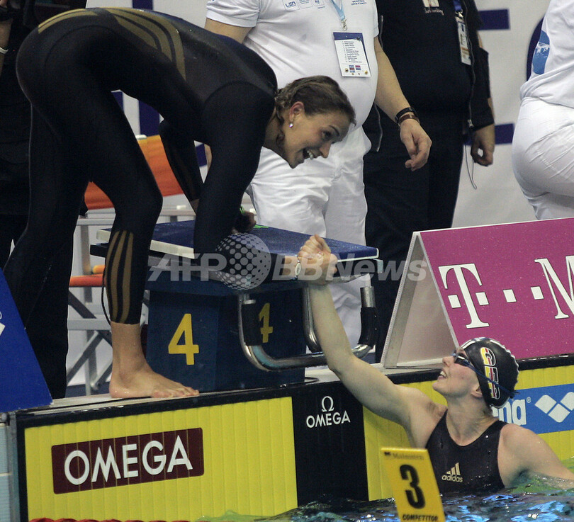 【12月16日 AFP】2007欧州短水路選手権(2007 European Short Course Swimming Championships)、女子4x50メートル・メドレーリレー。ドイツチーム(ジャニーン・ピーチJanine Pietsch、ヤネ・シェーファーJanne Schaefer、アニカ・メルホーンAnnika Mehlhorn、ブリッタ・シュテフェンBritta Steffen)は、世界新記録となる1分46秒67を記録して優勝を果たした。(c)AFP