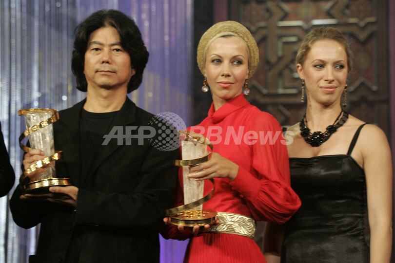 2007年12月15日、第7回マラケシュ国際映画祭(The 7th International Film Festival of Marrakech 略称:FIFM)の授賞式で(左から)主演女優賞を受賞した韓国の女優%%Yu Yun-mi%%のゴールデン・スター賞(%%golden star ward%%)を手に持つ、チョン・スーイル(%%Jeon Soo-il%%)監督、エストニア人プロデューサーの%%Katrin Kissa%%と女優の%%Tina Tauraite%%。(c)AFP/ABDELHAK SENNA