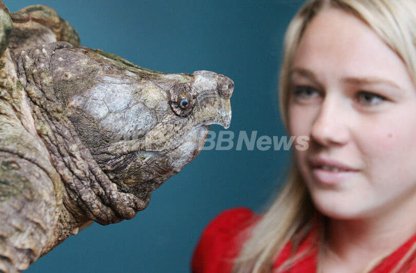 展示される動物のひとつである米南東部原産のワニガメは、成長すると最大で体重80キロにまで成長する。頭部はかなり大きく、上下のあごはトリのくちばしのようにとがった形をしている。