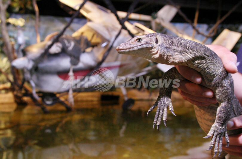ほかにもミズオオトカゲやニシキヘビなどの珍しい生き物や、白骨化した操縦士の乗った墜落機の模型などが展示される。(c)AFP/William WEST
