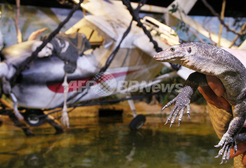 ほかにもミズオオトカゲやニシキヘビなどの珍しい生き物や、白骨化した操縦士の乗った墜落機の模型などが展示される。(c)AFP/William WEST