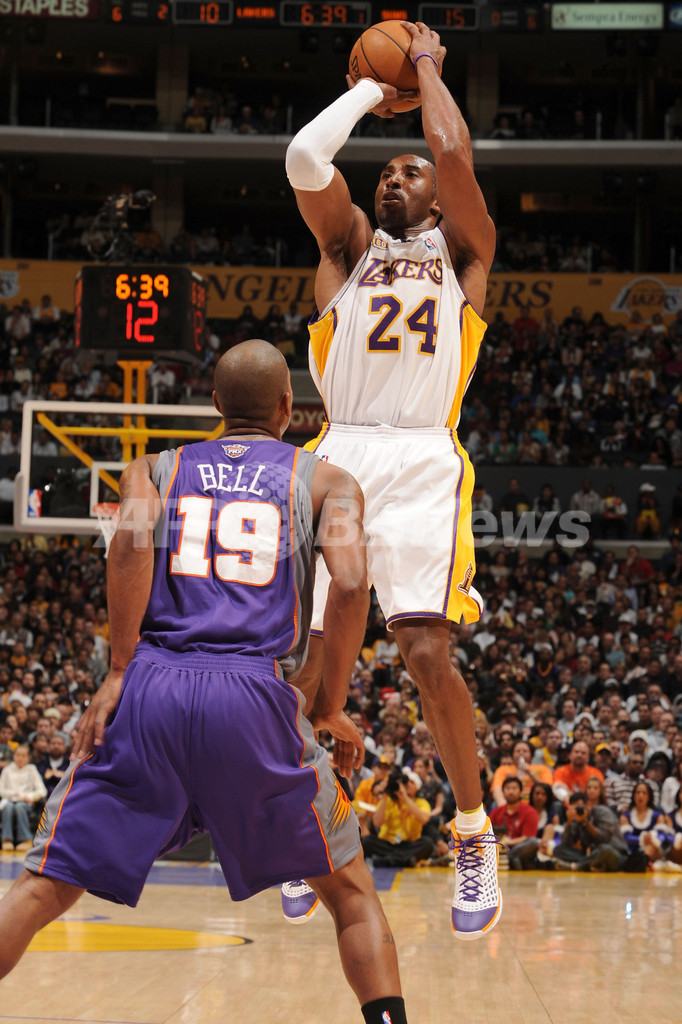 【12月26日 AFP】(写真追加)07-08NBA、ロサンゼルス・レイカーズ(Los Angeles Lakers)vsフェニックス・サンズ(Phoenix Suns)。試合はコービー・ブライアント(Kobe Bryant)がゲームハイとなる38得点を記録し、さらにアンドリュー・バイナム(Andrew Bynum)がキャリアハイとなる28得点に加え12リバウンドを記録しダブルダブルを活躍を見せたレイカーズが、122-115でサンズから勝利を収めた。1999年から毎年クリスマスに試合を行っているレイカーズは、クリスマスゲームの連敗を5で止めた。(c)AFP