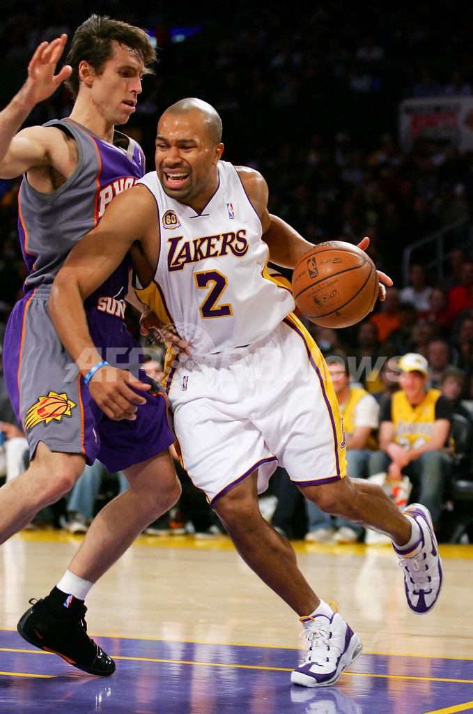【12月26日 AFP】(写真追加)07-08NBA、ロサンゼルス・レイカーズ(Los Angeles Lakers)vsフェニックス・サンズ(Phoenix Suns)。試合はコービー・ブライアント(Kobe Bryant)がゲームハイとなる38得点を記録し、さらにアンドリュー・バイナム(Andrew Bynum)がキャリアハイとなる28得点に加え12リバウンドを記録しダブルダブルを活躍を見せたレイカーズが、122-115でサンズから勝利を収めた。1999年から毎年クリスマスに試合を行っているレイカーズは、クリスマスゲームの連敗を5で止めた。(c)AFP