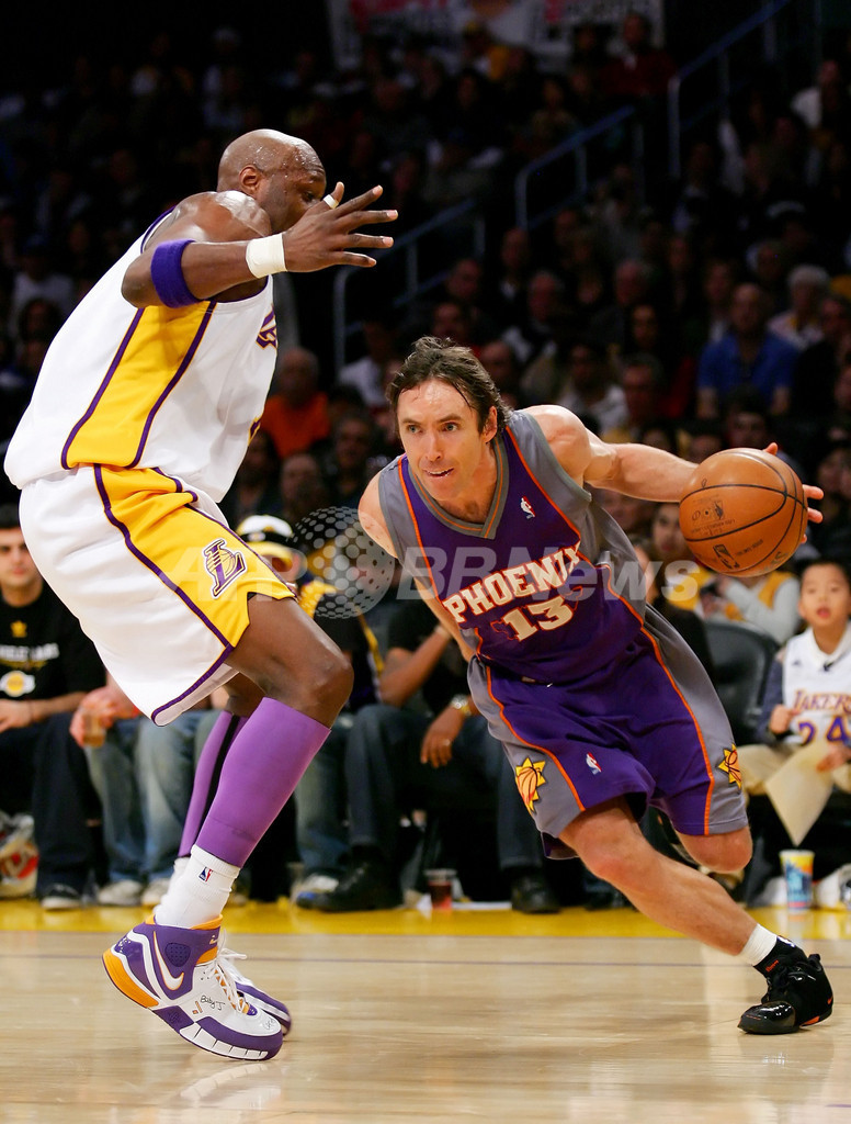 【12月26日 AFP】(写真追加)07-08NBA、ロサンゼルス・レイカーズ(Los Angeles Lakers)vsフェニックス・サンズ(Phoenix Suns)。試合はコービー・ブライアント(Kobe Bryant)がゲームハイとなる38得点を記録し、さらにアンドリュー・バイナム(Andrew Bynum)がキャリアハイとなる28得点に加え12リバウンドを記録しダブルダブルを活躍を見せたレイカーズが、122-115でサンズから勝利を収めた。1999年から毎年クリスマスに試合を行っているレイカーズは、クリスマスゲームの連敗を5で止めた。(c)AFP