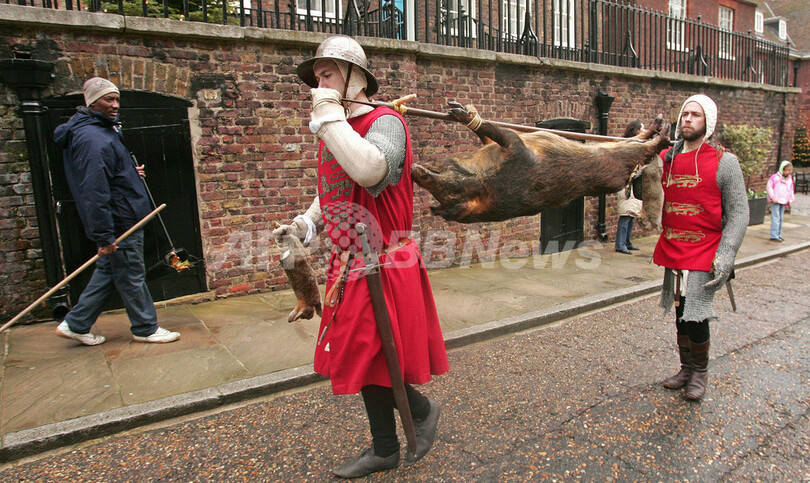【12月28日 AFP】英ロンドン(London)のロンドン塔(Tower of London)で27日、中世のクリスマス・セレモニーを再現する恒例のイベントが始まった。「メリー・メディーバル・クリスマス(Merry Medieval Christmas)」と呼ばれるこのイベントは、イングランド王エドワード1世(King Edward I)統治時代の1284年のクリスマスの様子を再現するもの。エドワード1世やその側近、騎士などに扮(ふん)した俳優たちが塔内を練り歩いたり、イノシシを棒に縛り付けて運ぶなどの姿が訪問客を楽しませた。(c)AFP