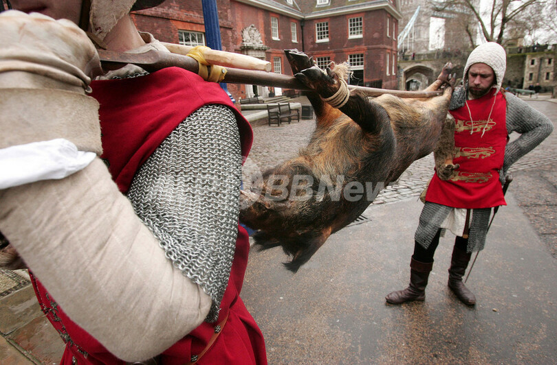 【12月28日 AFP】英ロンドン(London)のロンドン塔(Tower of London)で27日、中世のクリスマス・セレモニーを再現する恒例のイベントが始まった。「メリー・メディーバル・クリスマス(Merry Medieval Christmas)」と呼ばれるこのイベントは、イングランド王エドワード1世(King Edward I)統治時代の1284年のクリスマスの様子を再現するもの。エドワード1世やその側近、騎士などに扮(ふん)した俳優たちが塔内を練り歩いたり、イノシシを棒に縛り付けて運ぶなどの姿が訪問客を楽しませた。(c)AFP