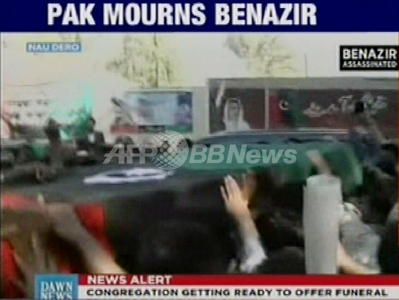 【12月28日 AFP】(12月29日 写真追加)パキスタンで前日に暗殺されたベナジル・ブット(Benazir Bhutto)元首相の葬儀が28日、故郷の南部シンド(Sindh)州で営まれ、遺体は同地のブット一族の墓地に埋葬された。国営テレビが伝えた。