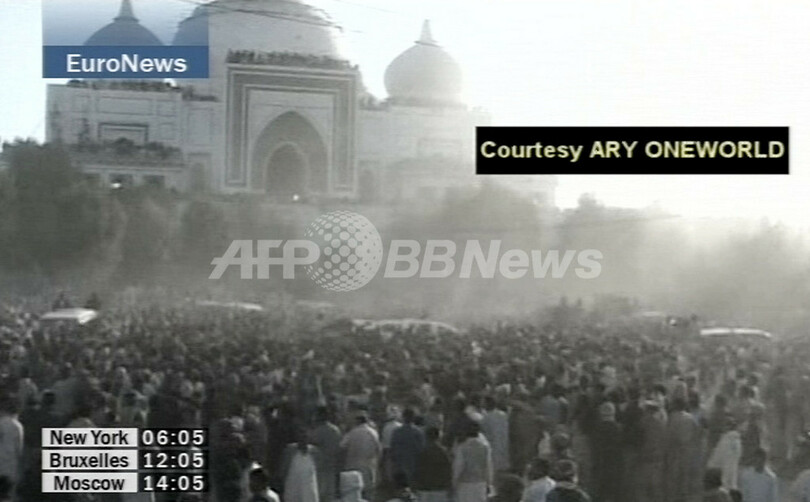 通りや沿道の建物を埋め尽くした数十万の群衆は、ブット元首相のひつぎが通り過ぎると、泣き声を上げたり胸を叩くなどして元首相の死を悼み、周囲は大きな悲しみに包まれた。(c)AFP