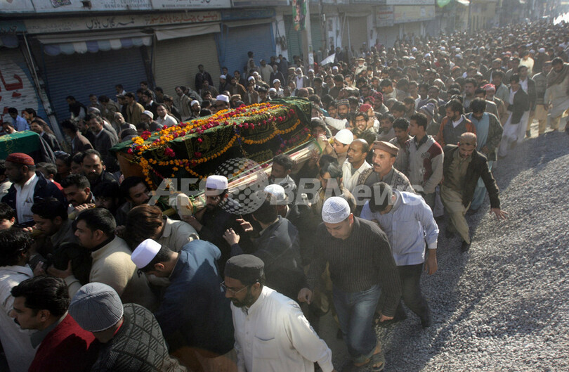 【12月28日 AFP】(12月29日 写真追加)パキスタンで前日に暗殺されたベナジル・ブット(Benazir Bhutto)元首相の葬儀が28日、故郷の南部シンド(Sindh)州で営まれ、遺体は同地のブット一族の墓地に埋葬された。国営テレビが伝えた。