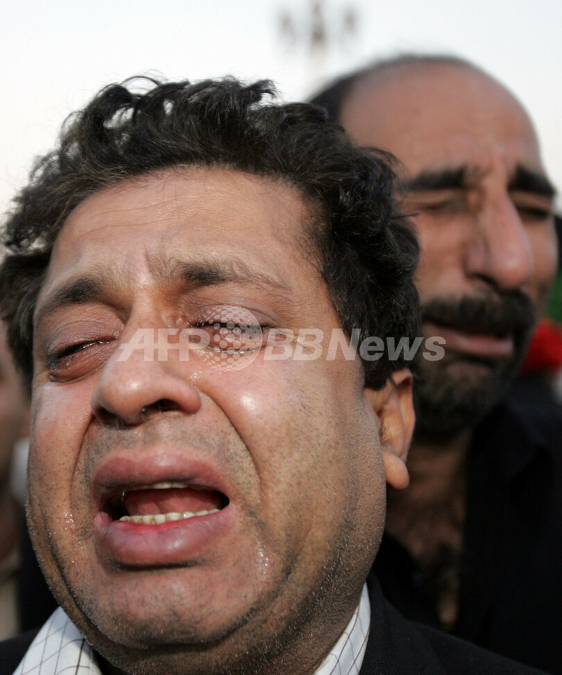通りや沿道の建物を埋め尽くした数十万の群衆は、ブット元首相のひつぎが通り過ぎると、泣き声を上げたり胸を叩くなどして元首相の死を悼み、周囲は大きな悲しみに包まれた。(c)AFP