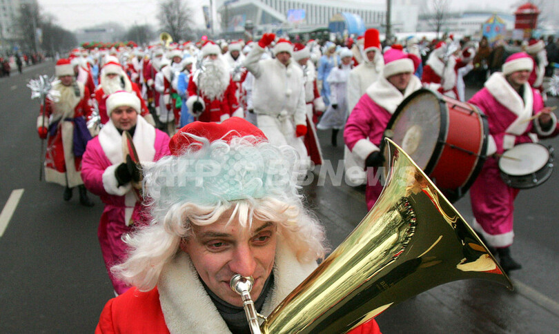 ニュース ライフ 新年サンタパレード、ベラルーシ 2007年12月31日 20:18 発信地:ミンスク/ベラルーシ [ ロシア・CIS ベラルーシ ] このニュースをシェア ‹ › ❮ 1/4 ❯ 2007年12月31日、ベラルーシの首都ミンスク(Minsk)で行われた新年を祝うパレードにロシア版サンタクロース「ファーザー・フロスト(Fathers Frost)」の扮装をして参加する準備をするベラルーシ軍の兵士たち。(c)AFP/VIKTOR DRACHEV 画像作成中 ! 【12月31日 AFP】ベラルーシの首都ミンスク(Minsk)で31日、新年を祝うパレードが行われた。ロシア版サンタクロース「ファーザー・フロスト(Fathers Frost)」の扮装をした約1000人が参加した。(c)AFP/VIKTOR DRACHEV ライフ 一覧へ> メディア・報道関係・法人の方向け 写真・動画 購入のお問合せ>
