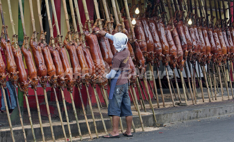 ニュース ライフ こぼれ話 フィリピンの新年、ブタの丸焼き「レチョン」とともに 2008年1月1日 6:57 発信地:マニラ/フィリピン [ アジア・オセアニア フィリピン ] このニュースをシェア ‹ › ❮ 1/4 ❯ 2007年12月31日、マニラ(Manila)で、ブタの丸焼き「レチョン」を並べる男性。(c)AFP/JES AZNAR 画像作成中 ! 【1月1日 AFP】フィリピンではブタを丸焼きにした料理「レチョン」で新年を祝うのが通例となっている。(c)AFP ライフ 一覧へ> メディア・報道関係・法人の方向け 写真・動画 購入のお問合せ>