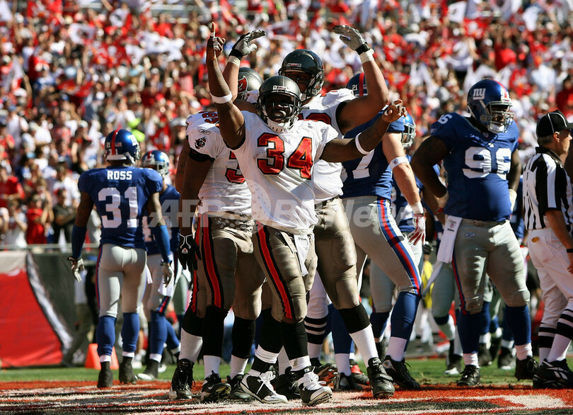 【1月7日 AFP】(写真追加)07NFLプレーオフNFC1回戦、タンパベイ・バッカニアーズ(Tampa Bay Buccaneers)vsニューヨーク・ジャイアンツ(New York Giants)。試合はイーライ・マニング(Eli Manning)が3度のタッチダウンを演出し、ジャイアンツが24-14でバッカニアーズを降し準決勝進出を決めた。ジャイアンツは現地13日に行われるNFC準決勝でダラス・カウボーイズ(Dallas Cowboys)と対戦する。