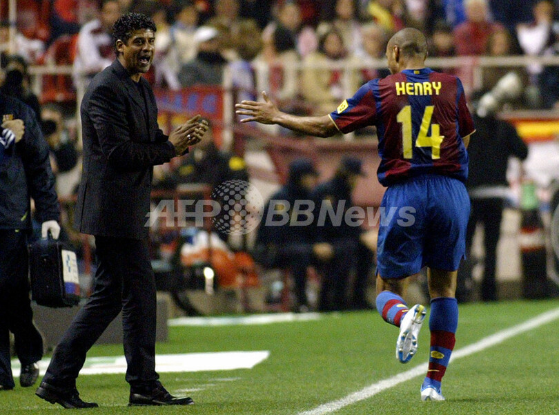 前半24分に先制点を決め、フランク・ライカールト(%%Frank Rijkaard%)監督(左)と歓喜するFCバルセロナのティエリ・アンリ(%%Thierry Henry%%)。(c)AFP/CRISTINA QUICLER