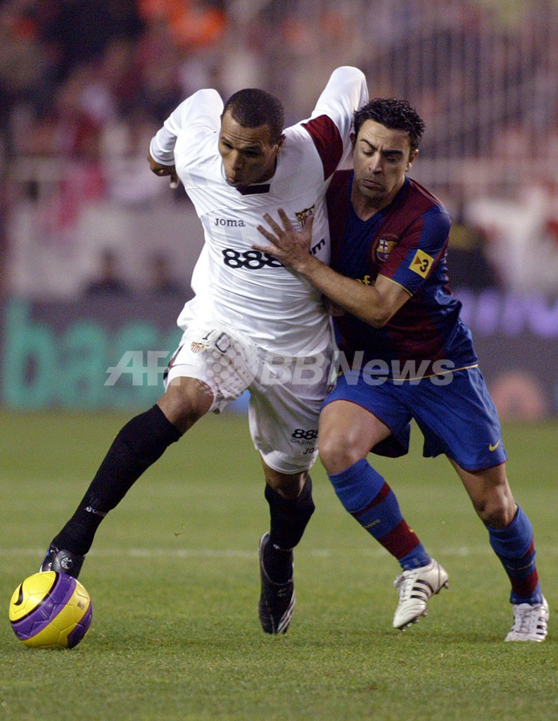 FCバルセロナのシャビ・エルナンデス(%%Xavi Hernandez%%、右)からチェックを受けるセビージャのルイス・ファビアーノ(%%Luis Fabiano%%)。(c)AFP/CRISTINA QUICLER