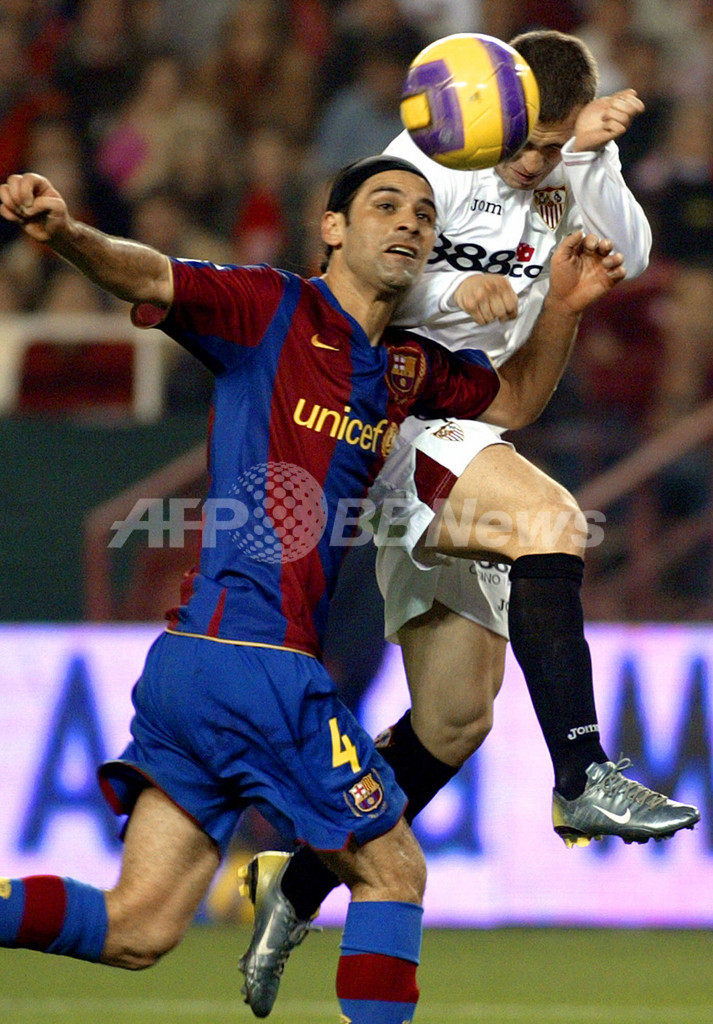 セビージャのアレクサンドゥル・ケルジャコフ(%%Alexander Kerzhakov%%、右)とボールを競るFCバルセロナのラファエル・マルケス(%%Rafael Marquez%%)。(c)AFP/CRISTINA QUICLER