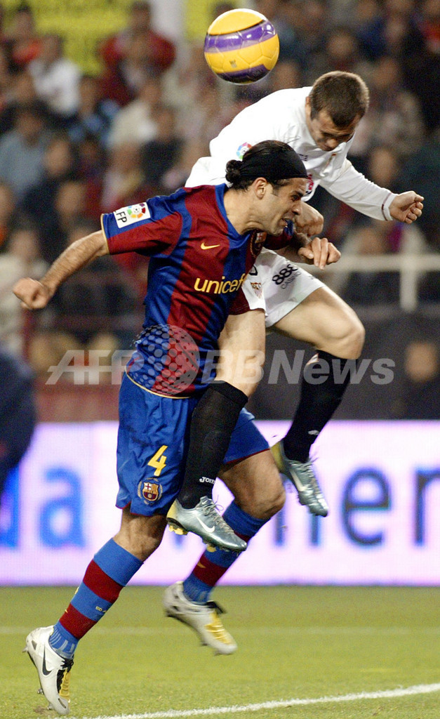 セビージャのアレクサンドゥル・ケルジャコフ(%%Alexander Kerzhakov%%、右)とボールを競るFCバルセロナのラファエル・マルケス(%%Rafael Marquez%%)。(c)AFP/CRISTINA QUICLER