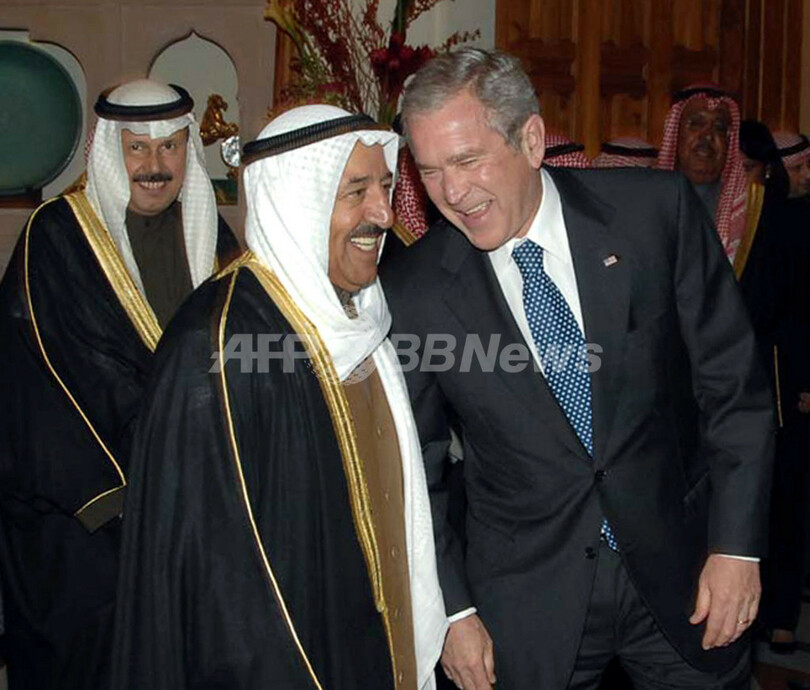 2008年1月11日、クウェートの首都クウェート市(Kuwait City)で、公式晩餐会に出席し、クウェートのサバハ・アハマド・ジャビル・サバハ(Sabah al-Ahmad al-Jabir al-Sabah)首長(左)と談笑するジョージ・W・ブッシュ(George W. Bush)米大統領(右)。(c)AFP/KUWAITI ROYAL PALACE