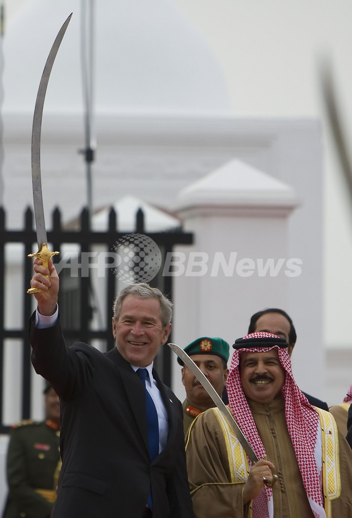 【1月13日 AFP】(1月13日 写真追加、一部更新)中東歴訪中のジョージ・W・ブッシュ(George W. Bush)米大統領は12日、湾岸諸国第2の訪問先バーレーンに到着、ハマド・ビン・イサ・ハリファ(Hamad bin Issa al-Khalifa)国王と会談した。