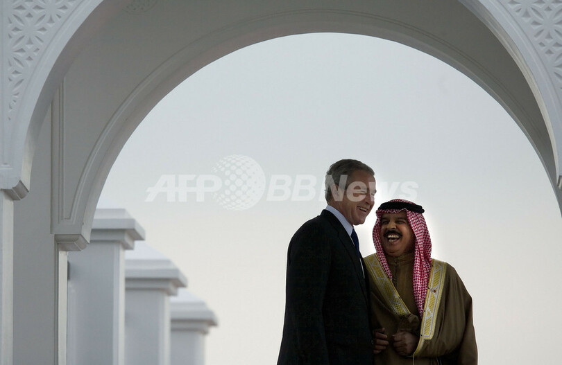 【1月13日 AFP】(1月13日 写真追加、一部更新)中東歴訪中のジョージ・W・ブッシュ(George W. Bush)米大統領は12日、湾岸諸国第2の訪問先バーレーンに到着、ハマド・ビン・イサ・ハリファ(Hamad bin Issa al-Khalifa)国王と会談した。