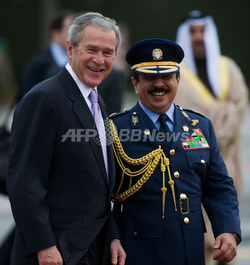 【1月13日 AFP】(1月13日 写真追加、一部更新)中東歴訪中のジョージ・W・ブッシュ(George W. Bush)米大統領は12日、湾岸諸国第2の訪問先バーレーンに到着、ハマド・ビン・イサ・ハリファ(Hamad bin Issa al-Khalifa)国王と会談した。