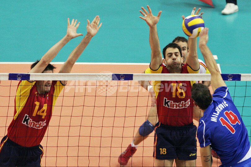 五輪 セルビア男子 決勝でスペインを破り北京五輪出場へ 2008年1月14日 3:28 発信地:イズミル/トルコ [ 中東・北アフリカ トルコ ] このニュースをシェア ‹ › ❮ 5/12 ❯ セルビアのイヴァン・ミリュコヴィッチ(%%Ivan Miljkovic%%、右)のスパイクをブロックするスペインのイスラエル・ロドリゲス(%%Israel Rodriguez%%、右2)とルイス・モルト・ホセ(%%Jose Luis Molto%%、左)。(c)AFP/MUSTAFA OZER 画像作成中 ! 【1月14日 AFP】バレーボール北京五輪欧州予選(European Olympic Qualification Tournament 2008)・男子・決勝、セルビアvsスペイン。試合はセルビアがフルセットの末3-2(24-26、16-25、25-19、25-15、17-15)でスペインを降し、北京五輪出場権を獲得した。(c)AFP 五輪 一覧へ> メディア・報道関係・法人の方向け 写真・動画 購入のお問合せ>