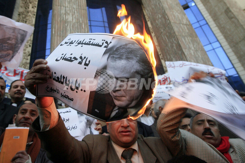 【1月15日 AFP】中東歴訪中のジョージ・W・ブッシュ(George W. Bush)米大統領が2日間の日程で訪問を予定しているエジプトの首都カイロ(Cairo)で14日、記者組合の事務所前に集結したデモ隊が、ブッシュ大統領の写真を燃やすなどして同大統領の訪問に抗議した。