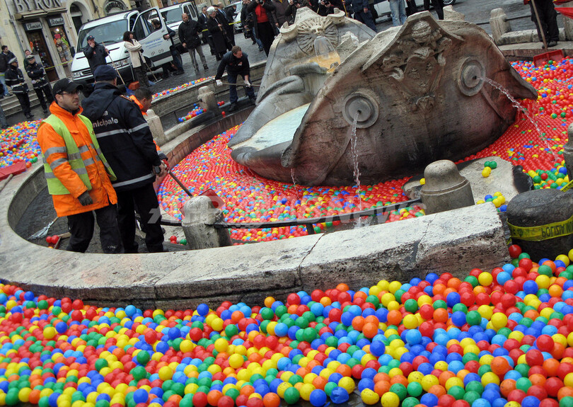 【1月17日 AFP】イタリアの首都ローマ(Rome)のスペイン広場(Piazza di Spagna)で16日、自称「アート抗議活動家」らがスペイン階段(Spanish Step)の上から大量のカラフルなプラスチックボールをばらまき、広場中心にある噴水をボールで埋め尽くすという事件が起きた。この噴水は「バルカッチャの泉(Barcaccia fountain)」と呼ばれるもので、彫刻家ピエトロ・ベルニーニ(Pietro Bernini)の作品。「アート抗議活動家」の1人、Graziano Cecchiniさんは同国の通信社ANSAに対し、この国の問題を明らかにするために行ったと主張している。(c)AFP