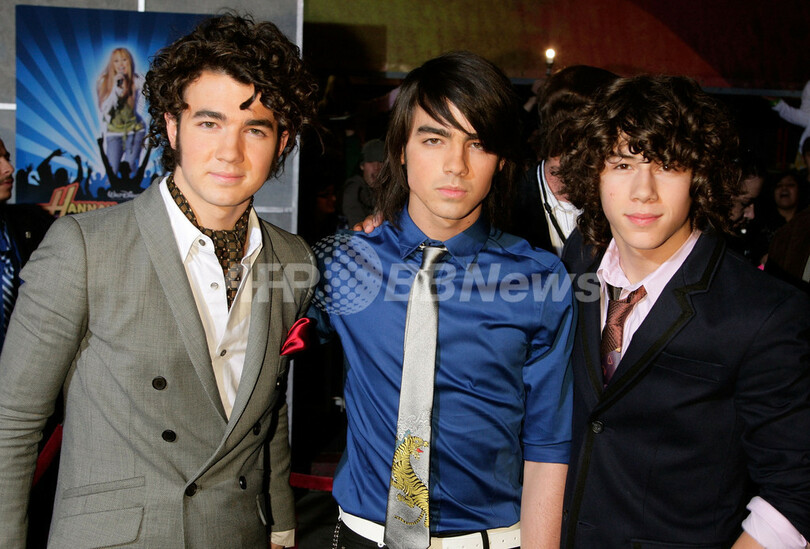 2008年1月17日、ハリウッドのエル・キャピタン・シアター(El Capitan Theatre)で開催された、ディズニー・チャンネル(Disney Channel)のファミリードラマ「Hannah Montana」のプレミア上映会に登場したバンド、ジョナス・ブラザーズ(%%The Jonas Brothers%%)の(左から)ケヴィン・ジョナス(%%Kevin Jonas%%)、ジョー・ジョナス(%%Joe Jonas%%)、ニック・ジョナス(%%Nick Jonas%%)。(c)AFP/Getty Images/Kevin Winter