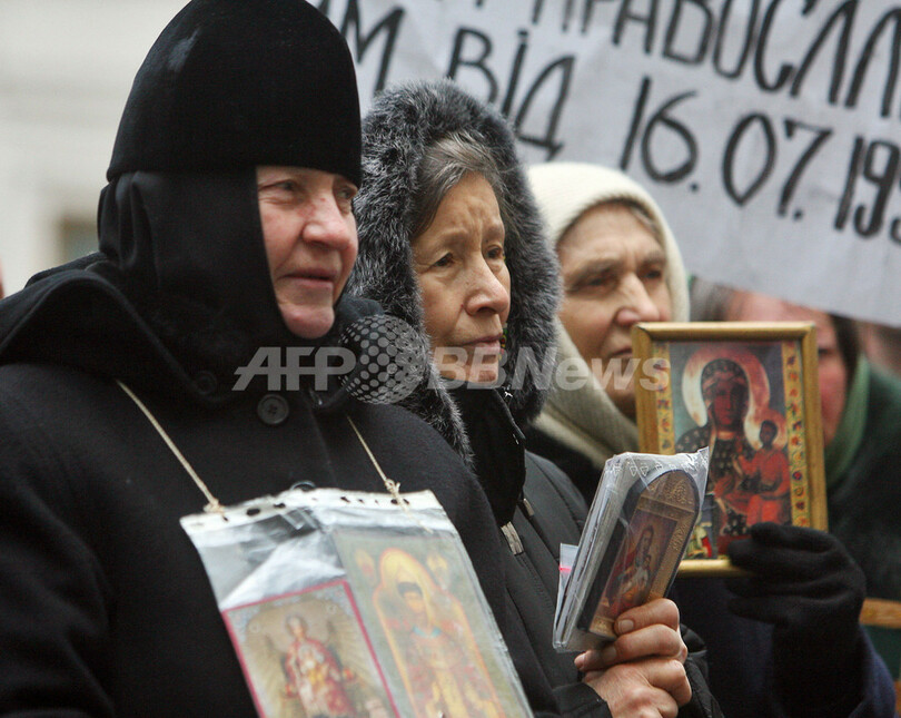 【1月20日 AFP】ウクライナのキエフ(Kiev)で17日、北大西洋条約機構(NATO)加盟を目指す親欧米派のビクトル・ユーシェンコ(Viktor Yushchenko)大統領に抗議するデモが、ウクライナ正教会の主導で行われた。