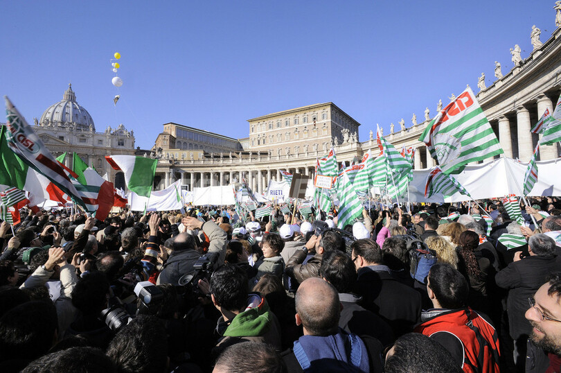 【1月21日 AFP】ローマ法王ベネディクト16世(Pope Benedict XVI)が学生らの反対でローマ大学サピエンツァ校(La Sapienza)での演説を中止したことを受け20日、バチカンのサンピエトロ広場(St Peter's Square)には、法王への支持を示めそうと、10万人以上の信者らが集まった。
