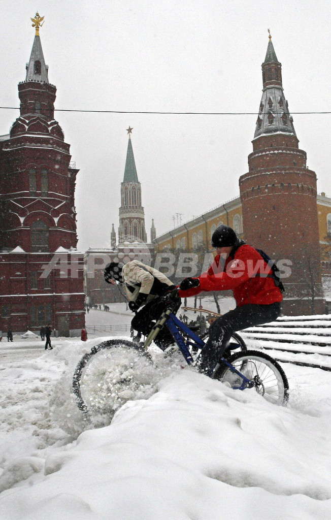 ニュース 社会 ロシア・モスクワで大雪、白銀の中の動と静 2008年1月21日 13:32 発信地:モスクワ/ロシア [ ロシア・CIS ロシア ] このニュースをシェア ‹ › ❮ 2/3 ❯ 2008年1月20日、ロシアの首都モスクワ(Moscow)にあるクレムリン(Kremlin)付近の雪の中で自転車を楽しむ人々。(c)AFP/ALEXEY SAZONOV 画像作成中 ! 【1月21日 AFP】(写真追加)ロシアの首都モスクワ(Moscow)は20日、大雪に見舞われた。白銀の世界となった市内では、雪の中で自転車を楽しむ人々や、寒さの中で微動だにせず佇む衛兵の姿が撮影された。(c)AFP 社会 一覧へ> メディア・報道関係・法人の方向け 写真・動画 購入のお問合せ>