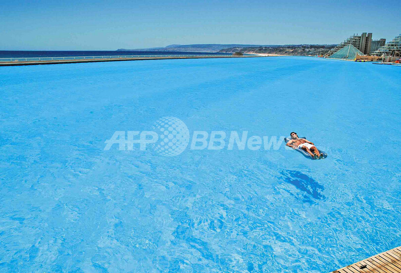 【1月23日 AFP】チリの首都サンティアゴ(Santiago)にあるシーサイドリゾートのプールが、「世界最大のプール」としてギネス世界記録(Guinness World record)に正式認定された。全長1013メートル、面積8ヘクタール、水量25万立方メートルを誇り、小型ボートでの航行が可能だ。(c)AFP