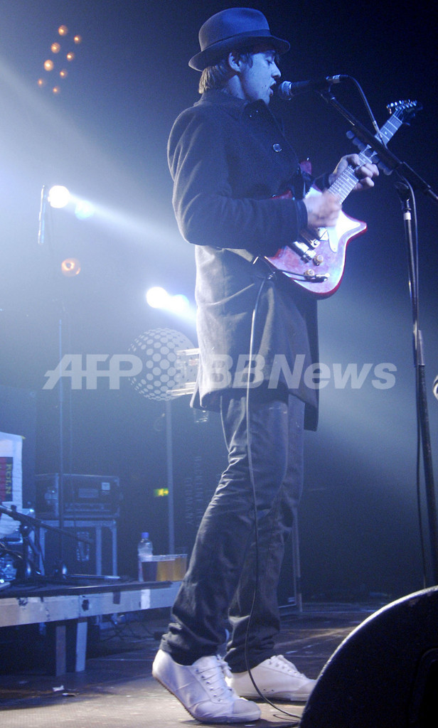 2008年1月22日、 ドイツ西部ケルン(Cologne)にあるライブ・ミュージック・ホール(Live Music Hall)でパフォーマンスを行う、英ロックグループ、ベイビーシャンブルズ(Babyshambles)のフロントマン、ピート・ドハーティ(%%Pete Doherty%%)。(c)AFP/DDP/HENNING KAISER