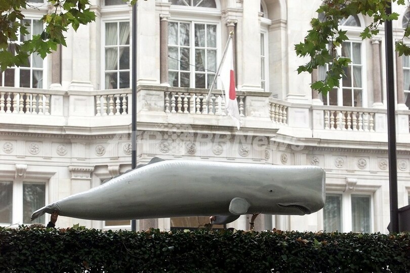 【1月25日 AFP】英ロンドン(London)の日本大使館で24日、不法侵入して調査捕鯨活動に対する抗議活動を行った英国人少女と父親の2人が警察に逮捕された。