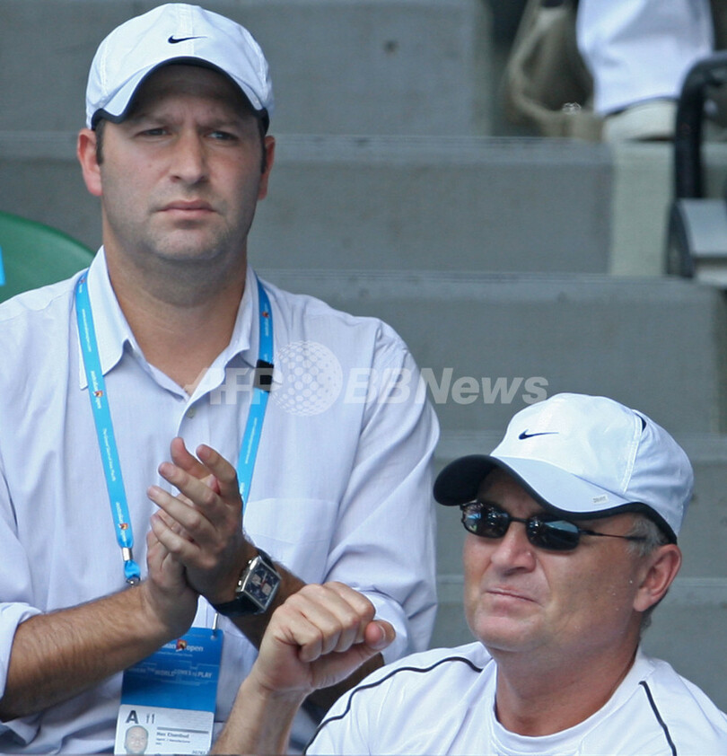 1時間31分で勝利を収めたシャラポワは、優勝が決まりコートで泣き崩れた後、父のユーリー・シャラポフ(Yuri Sharapov)氏と握手するためにスタンドに駆けつけた。(c)AFP/Neil Sands